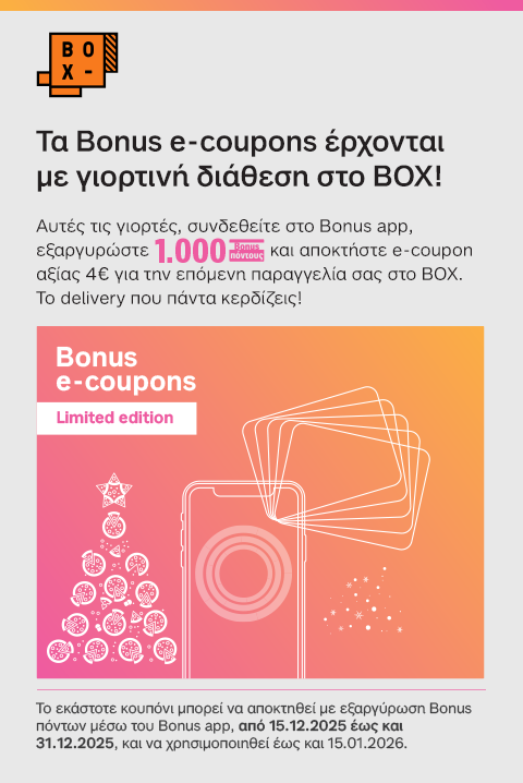 Αυτές τις γιορτές, συνδεθείτε στο Bonus app, εξαργυρώστε 1.000 Bonus πόντους και αποκτήστε e-coupon αξίας 4€ για την επόμενη παραγγελία σας στο BOX. Το delivery που πάντα κερδίζεις!