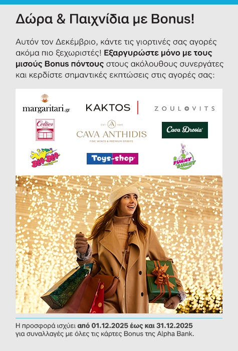 Η προσφορά ισχύει από 01.12.2025 έως και 31.12.2025 για συναλλαγές με όλες τις κάρτες Bonus της Alpha Bank.