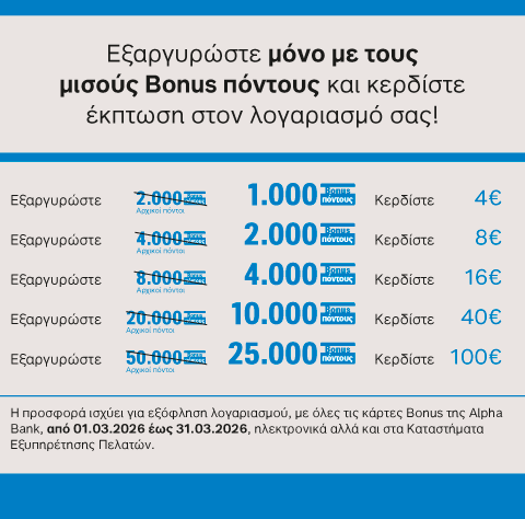 Η προσφορά ισχύει για εξόφληση λογαριασμού, με όλες τις κάρτες Bonus της Alpha Bank, από 01.03.2026 έως 31.03.2026, ηλεκτρονικά αλλά και στα Καταστήματα Εξυπηρέτησης Πελατών.
