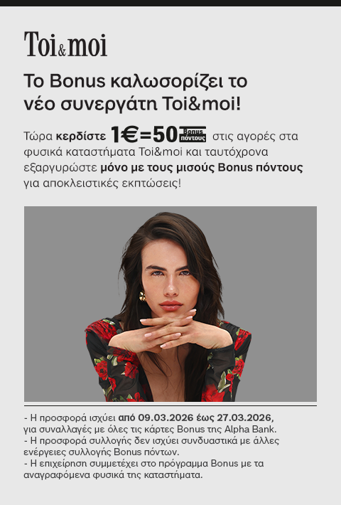 Από 09.03.2026 έως 27.03.2026, κερδίστε 1€=50 Bonus πόντους στις αγορές στα φυσικά καταστήματα Toi&moi και ταυτόχρονα εξαργυρώστε μόνο με τους μισούς Bonus πόντους για αποκλειστικές εκπτώσεις!