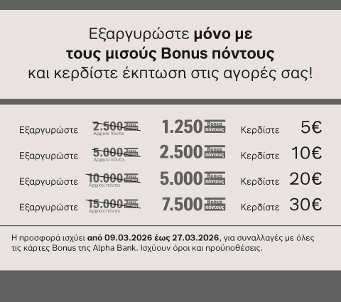 - Η προσφορά ισχύει από 09.03.2026 έως 27.03.2026, για συναλλαγές με όλες τις κάρτες Bonus της Alpha Bank.