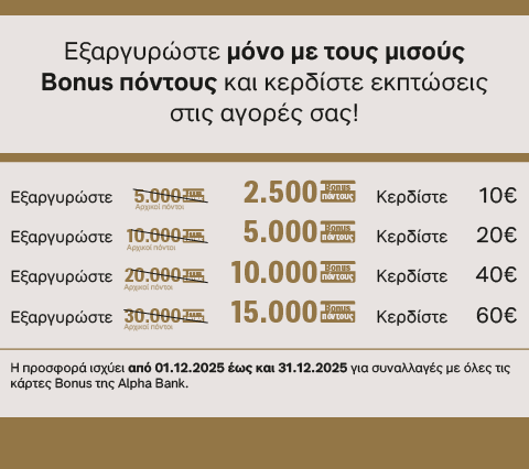 Η προσφορά ισχύει από 01.12.2025 έως και 31.12.2025 για συναλλαγές με όλες τις κάρτες Bonus της Alpha Bank.