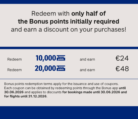 Choose the travels you are interested in from the destinations on offer, redeem your Bonus points online on AEGEAN’s website at www.aegeanair.com or by clicking on the special link: https://alphabankbonusredemptionel.aegeanair.com/ (accessible only from Greece), as well as through AEGEAN’s Call Center at 801 11 20000 or +30 210 62 61 000 (at an additional charge of €23).