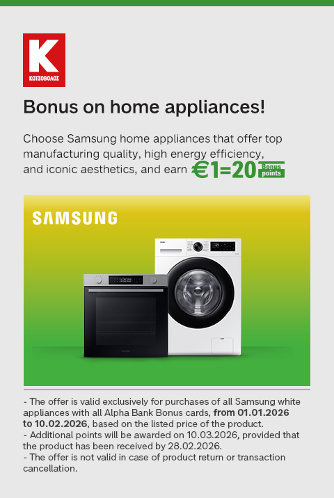At Kotsovolos, a Major Partner of the Bonus Program, Alpha Bank Bonus cardholders earn 4 Bonus points for every €1 of their purchases and can redeem them on every transaction, enjoying up to 100% benefit on their purchases.