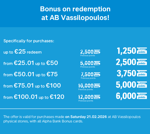 The offer is valid for purchases made on Saturday 21.02.2026 at AB Vassilopoulos physical stores, with all Alpha Bank Bonus cards.