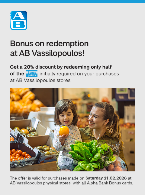 Get a 20% discount by redeeming only half of the Bonus points initially required on your purchases at AB Vassilopoulos stores.