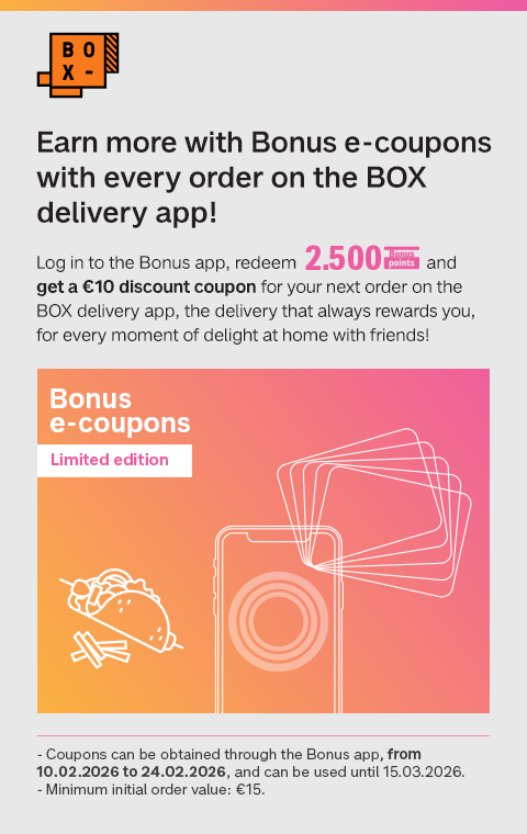 Log in to the Bonus app, redeem 2,500 Bonus points, and get a €10 discount coupon for your next order on the BOX delivery app, the delivery that always rewards you, for every moment of delight at home with friends!