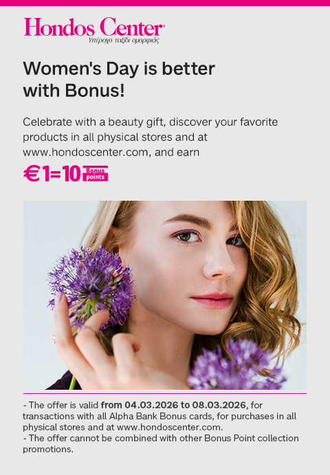 - The offer is valid from 04.03.2026 to 08.03.2026, for transactions with all Alpha Bank Bonus cards, for purchases in all physical stores and at www.hondoscenter.com.