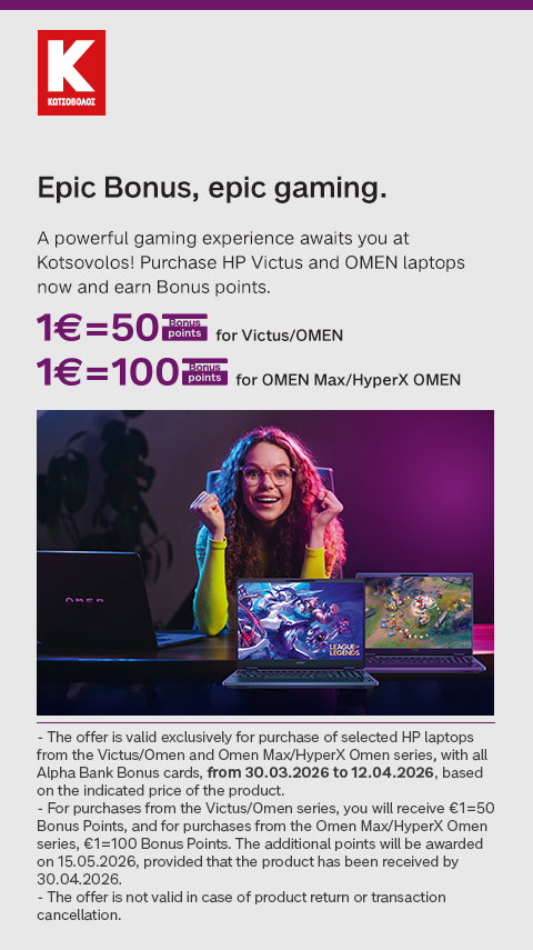-The offer is valid exclusively for purchase of selected HP laptops from the Victus/Omen and Omen Max/HyperX Omen series, with all Alpha Bank Bonus cards, from 30.03.2026 to 12.04.2026, based on the indicated price of the product.