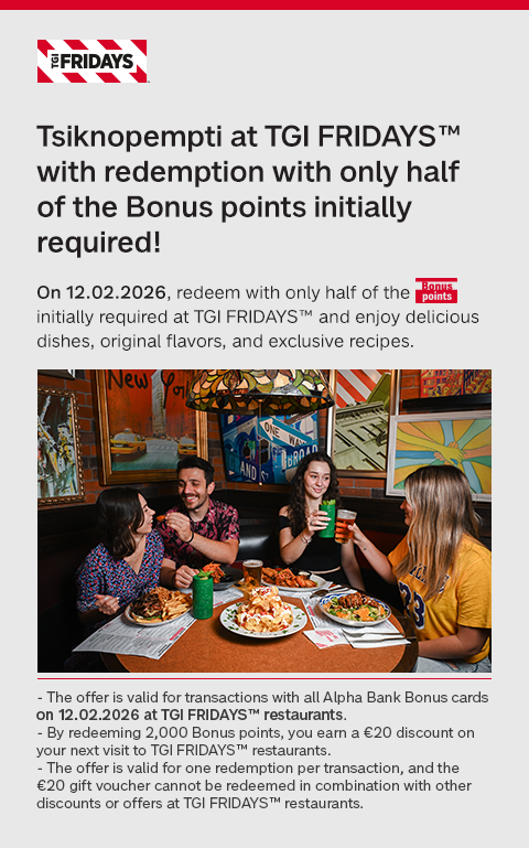 - The offer is valid for transactions with all Alpha Bank Bonus cards on 12.02.2026 at TGI FRIDAYS™ restaurants.