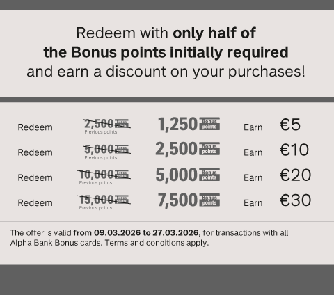 - The offer is valid from 09.03.2026 to 27.03.2026, for transactions with all Alpha Bank Bonus cards.