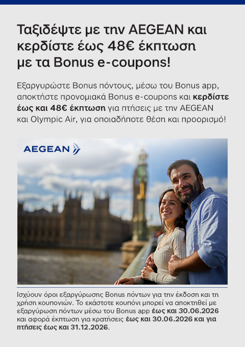 • Ταξιδέψτε με την AEGEAN και κερδίστε έως 48€ έκπτωση με τα Bonus e-coupons!
