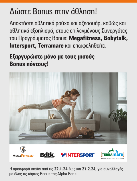Make your purchases of clothes, accessories, and sports equipment, and redeem only half the Bonus points initially required, with transactions with all Alpha Bank Bonus cards, at selected Program Partners from 22.1.24 until 21.2.24.