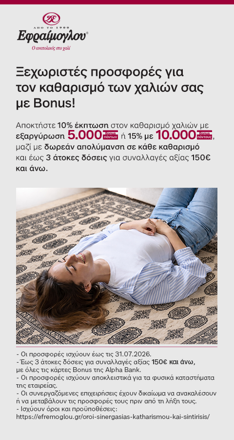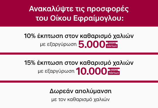 Αποκτήστε 10% έκπτωση στον καθαρισμό χαλιών με εξαργύρωση 5.000 Bonus πόντων ή 15% με εξαργύρωση 10.000 Bonus πόντων, μαζί με δωρεάν απολύμανση σε κάθε καθαρισμό και έως 3 άτοκες δόσεις για συναλλαγές αξίας 150€ και άνω.