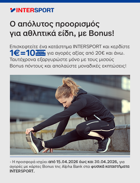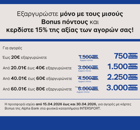 - H προσφορά ισχύει από 15.04.2026 έως και 30.04.2026 με κάρτες Bonus της Alpha Bank στα φυσικά καταστήματα INTERSPORT.