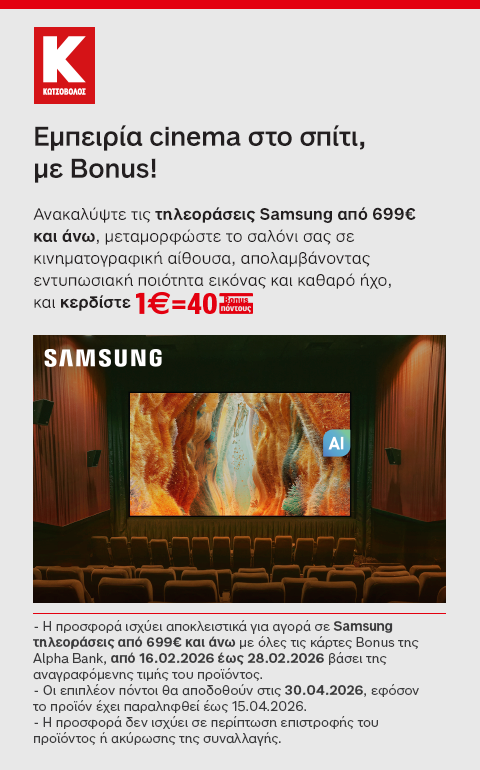 - Η προσφορά ισχύει αποκλειστικά για αγορά σε τηλεοράσεις Samsung από 699€ και άνω με όλες τις κάρτες Bonus της Alpha Bank, από 16.02.2026 έως 28.02.2026 βάσει της αναγραφόμενης τιμής του προϊόντος.