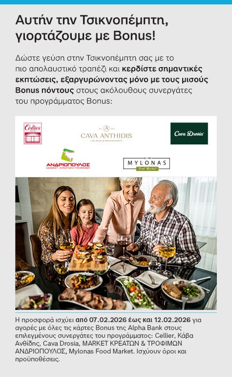 - Η προσφορά ισχύει από 07.02.2026 έως και 12.02.2026 για αγορές με όλες τις κάρτες Bonus της Alpha Bank στους επιλεγμένους συνεργάτες του προγράμματος: Cellier, Κάβα Ανθίδης, Cava Drosia, MARKET ΚΡΕΑΤΩΝ & ΤΡΟΦΙΜΩΝ ΑΝΔΡΙΟΠΟΥΛΟΣ, Mylonas Food Market.